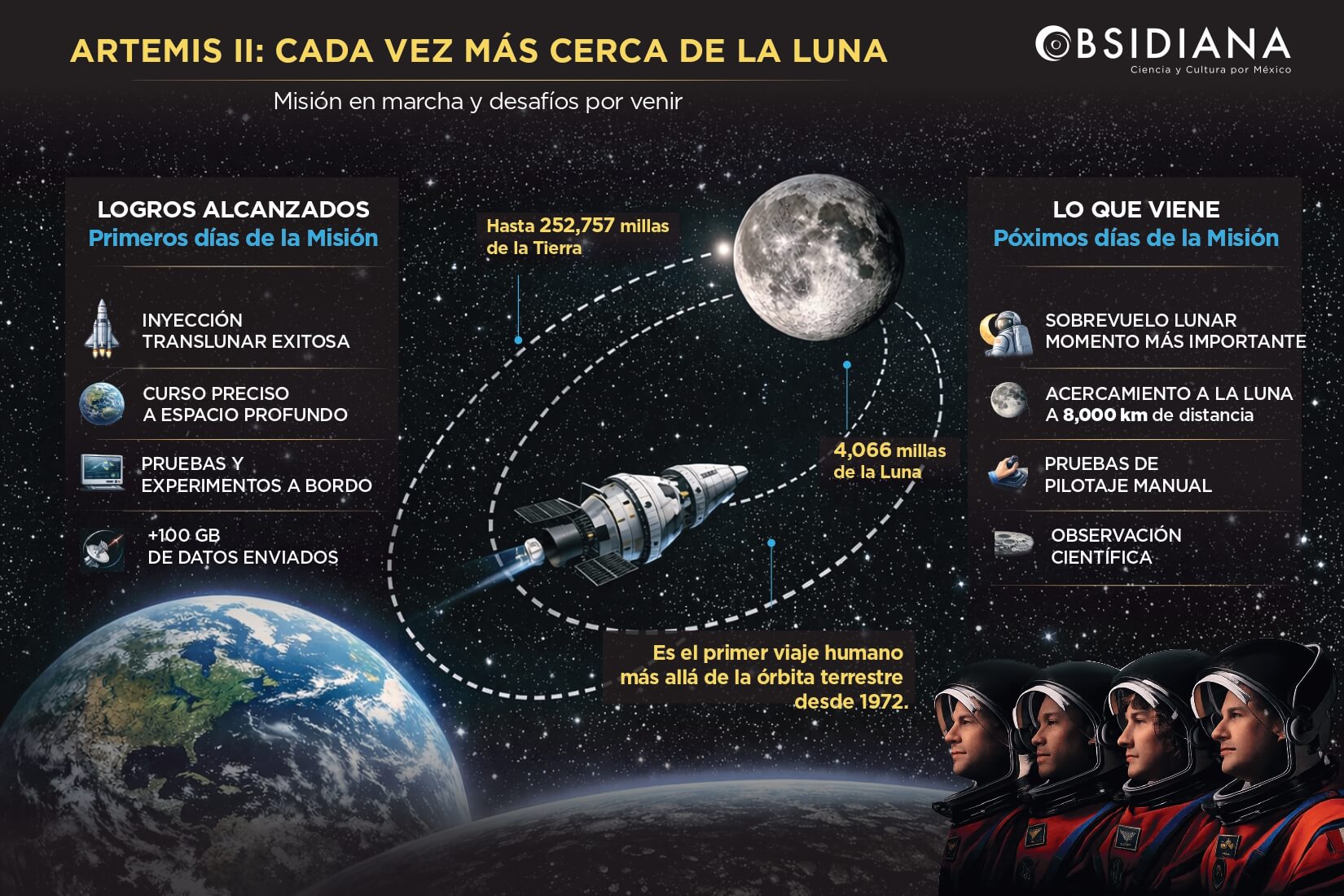 Obsidiana: Ciencia y Cultura por México dará seguimiento puntual a los avances de Artemis II, compartiendo información clave sobre sus implicaciones científicas y tecnológicas. Invitamos a nuestros lectores a seguir esta cobertura especial en las plataformas oficiales.